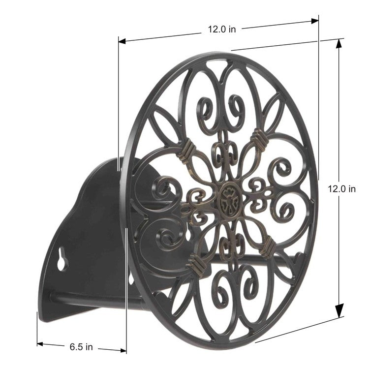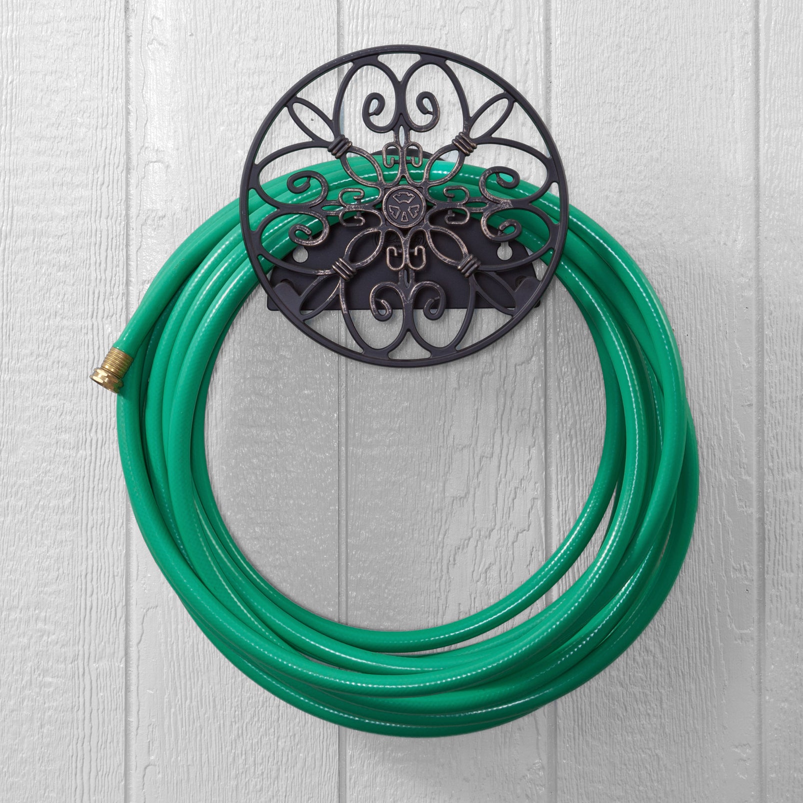 The Liberty model 670 decorative hose hanger mounts onto almost any surface and is easy to install. Features rust free, cast aluminum construction; a decorative gold patina design, and a durable powder coat finish.