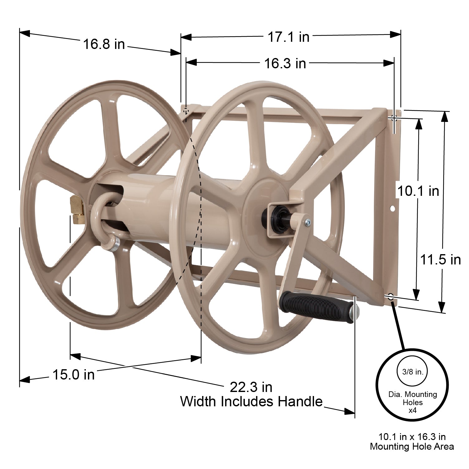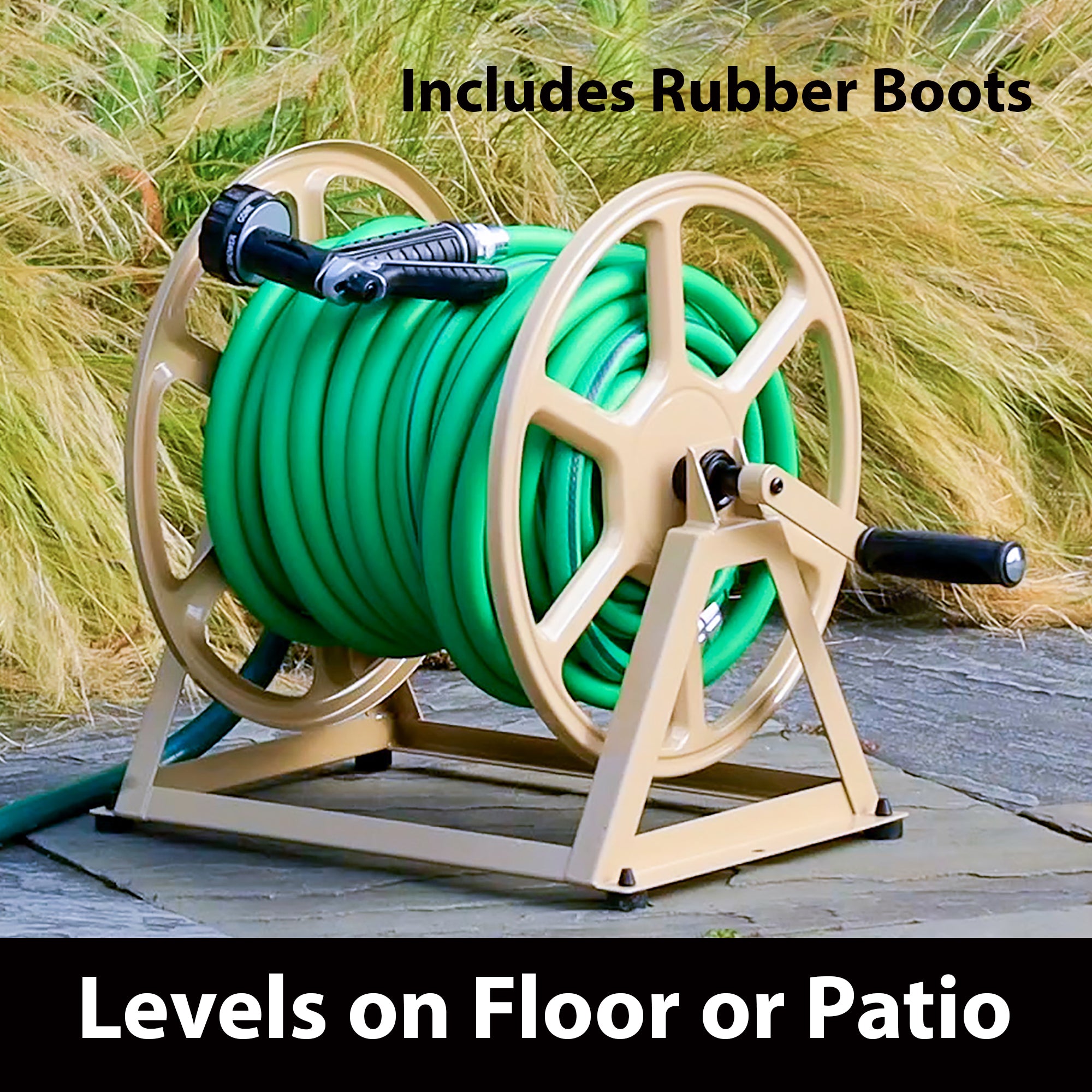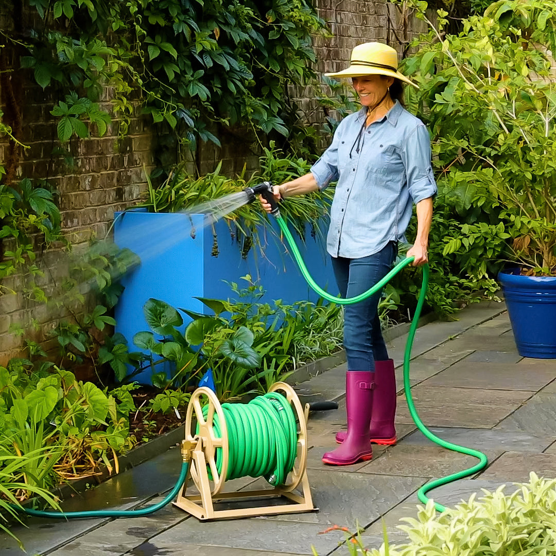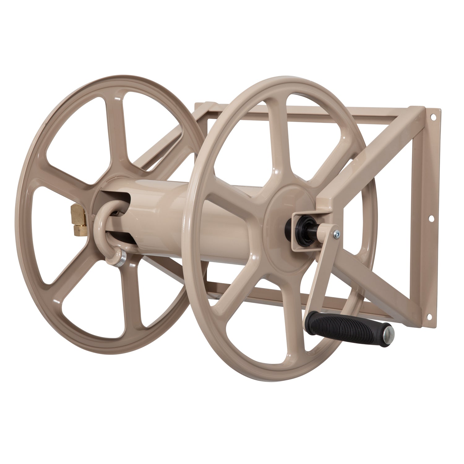 Mount your hose reel on the wall or on the ground with our newly designed Model 709 Dual Mount Hose Reel. Made of heavy gauge steel construction with a durable powder coat finish, brass fixtures, and holds 200 feet of 5/8 inch hose capacity.