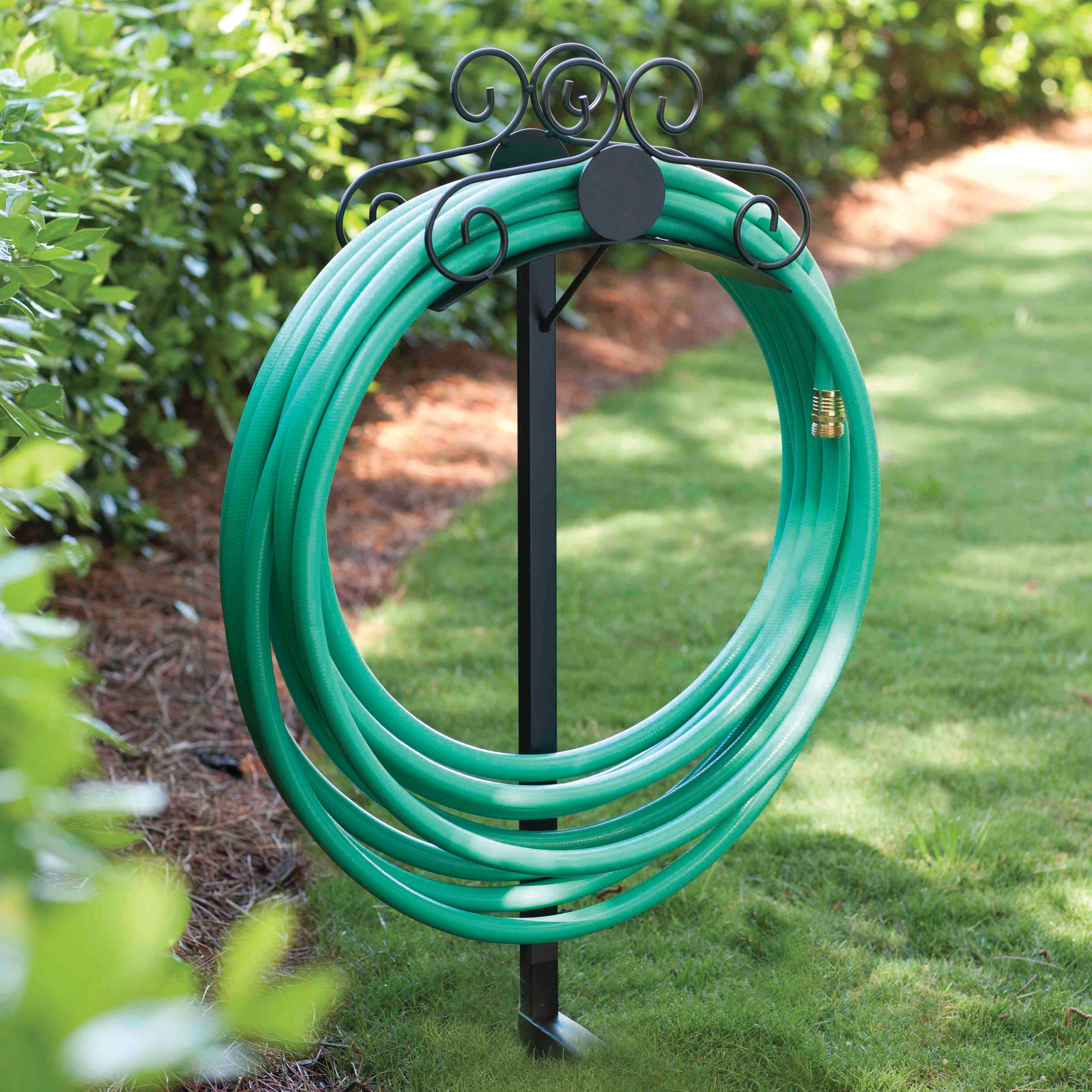 The Liberty Model 645 decorative hose stand offers an attractive solution for storing your garden hose! Features 2-prong anchors that easily secures the hose stand into place; no cement or post holes are required. Made of heavy gauge steel with a durable powder coat finish and has a step down feature for sturdy support.