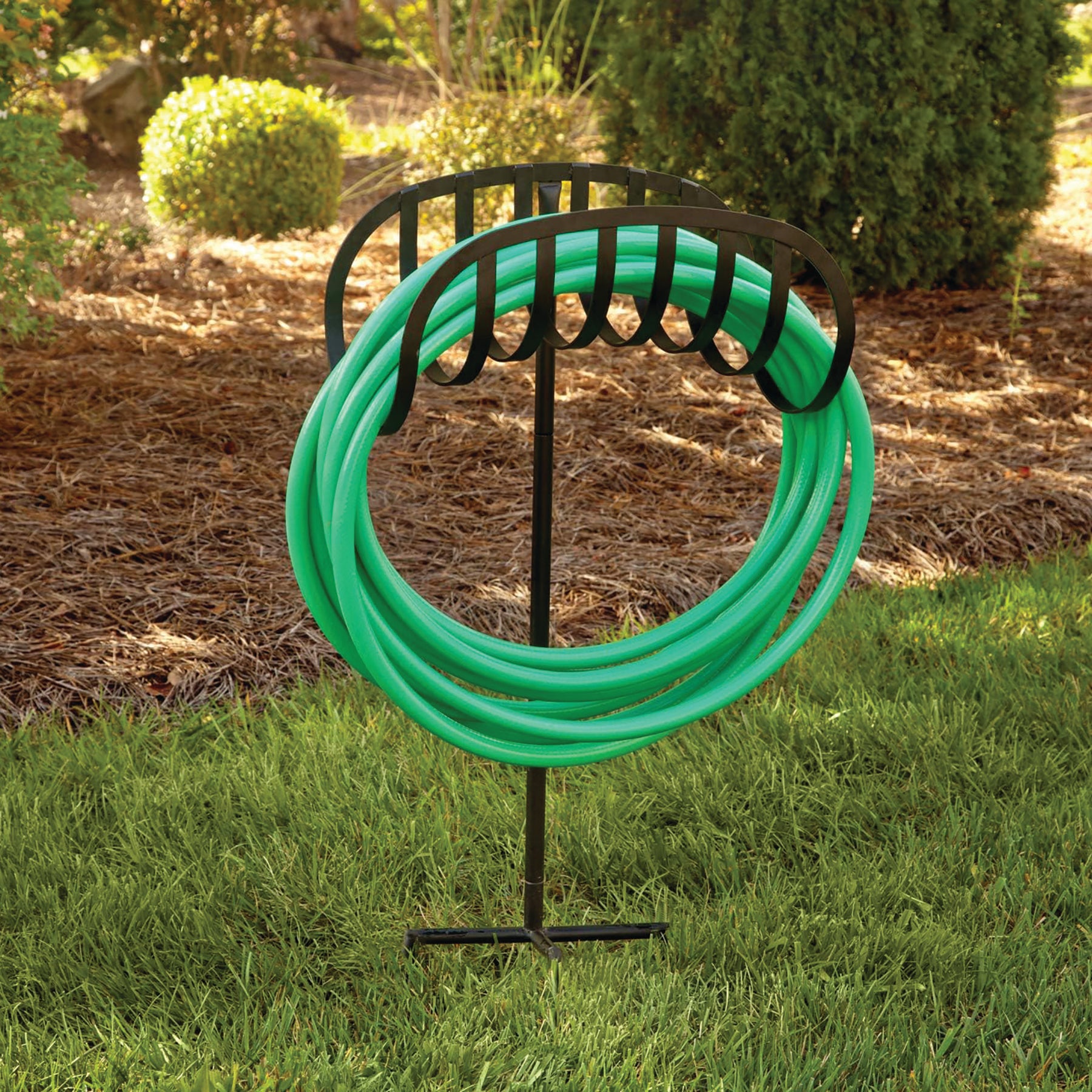 The Liberty model 647 manger hose stand offers an attractive solution for storing your garden hose! Features 3-prong anchors that easily secures the hose stand into place; no cement or post holes are required. Made of heavy gauge steel with a durable powder coat finish.