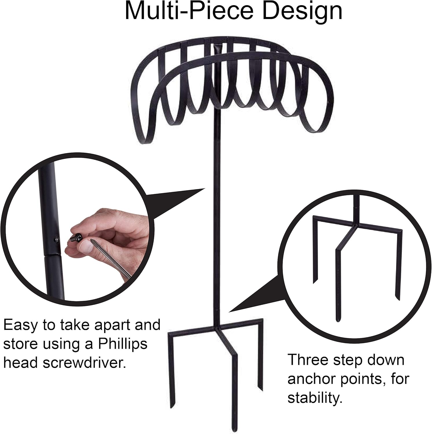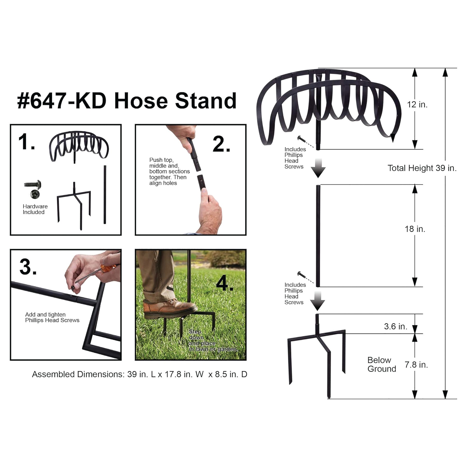 The Liberty model 647-KD manger hose stand offers an attractive solution for storing your garden hose! Features 3-prong anchors that easily secures the hose stand into place; no cement or post holes are required. Made of heavy gauge steel with a durable powder coat finish.