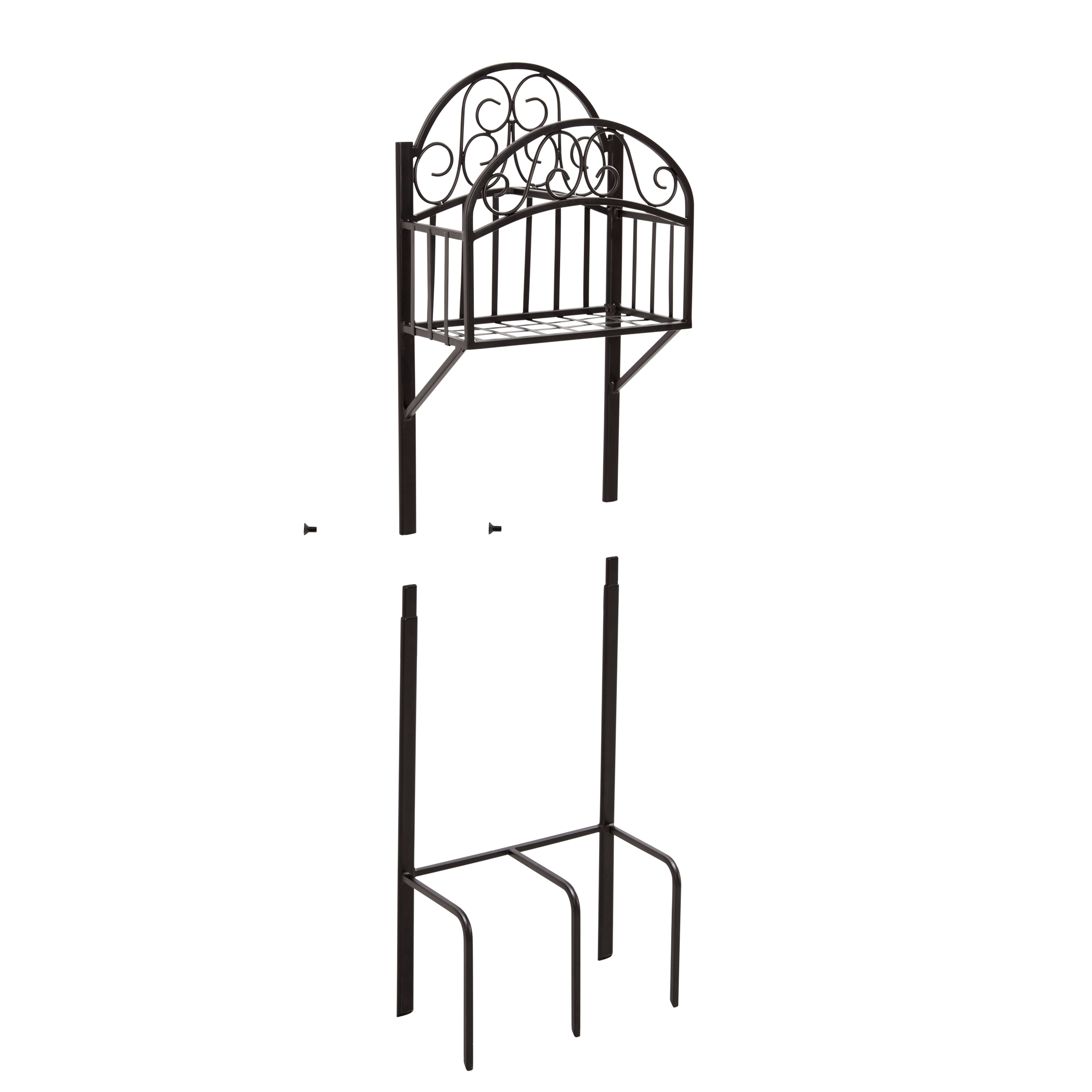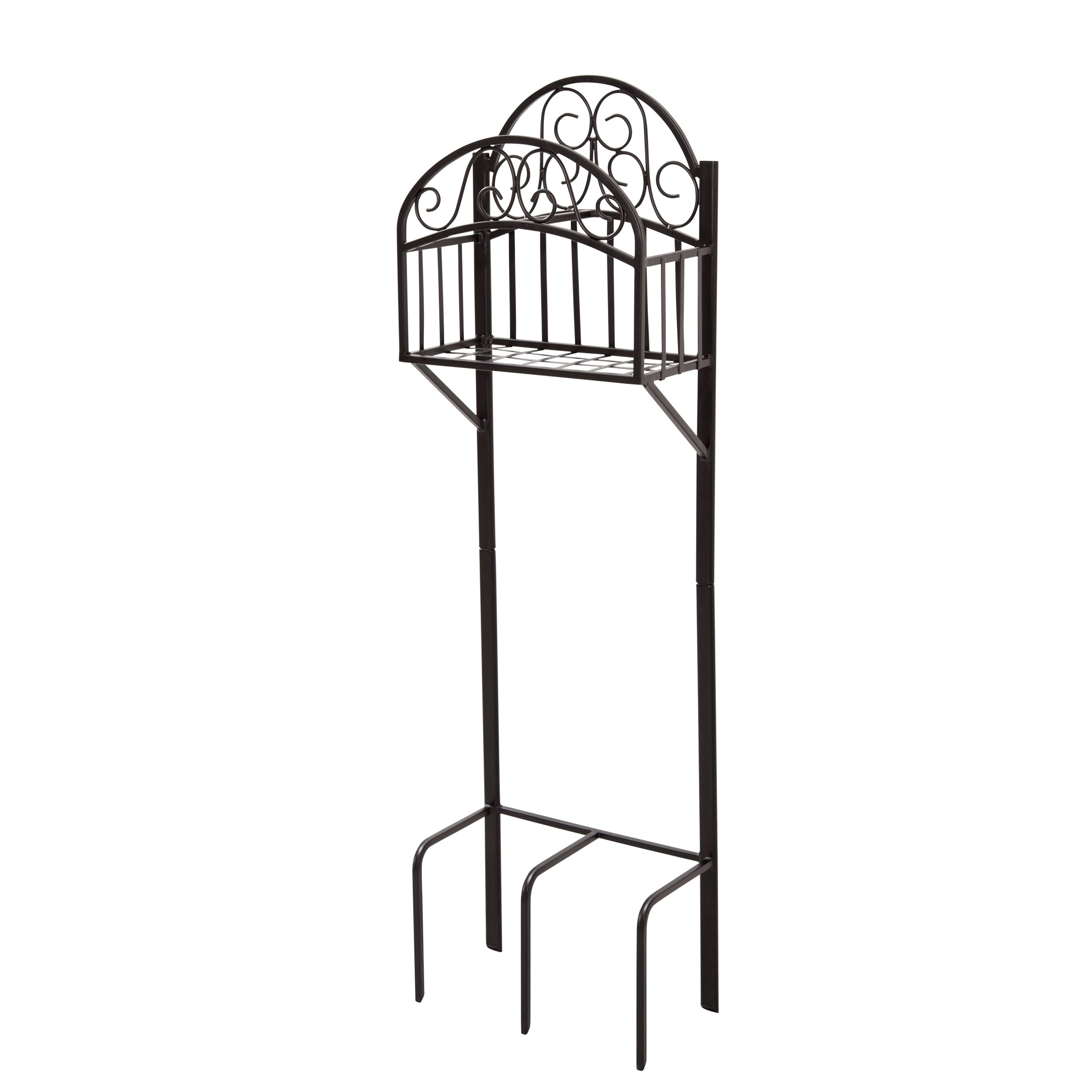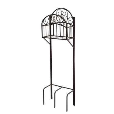 The Liberty model 119-KD decorative hose stand with shelf offers an attractive solution for storing your garden hose! Features 5 prong anchors that easily secures the hose stand into place; no cement or post holes are required. Made of heavy gauge steel with a durable powder coat finish and a storage shelf.