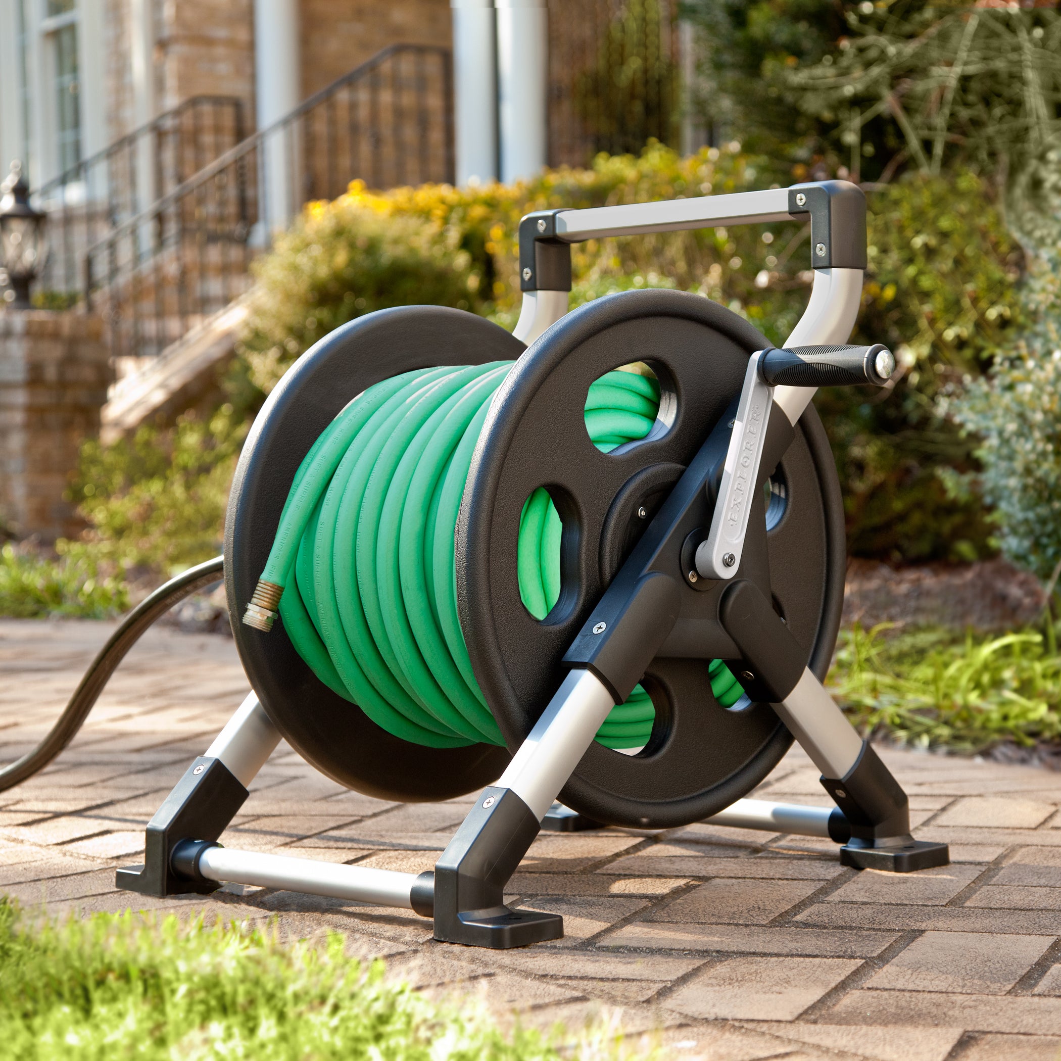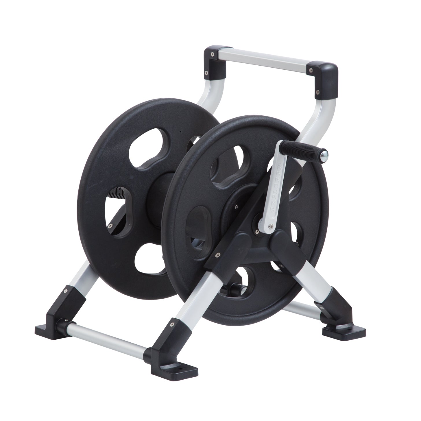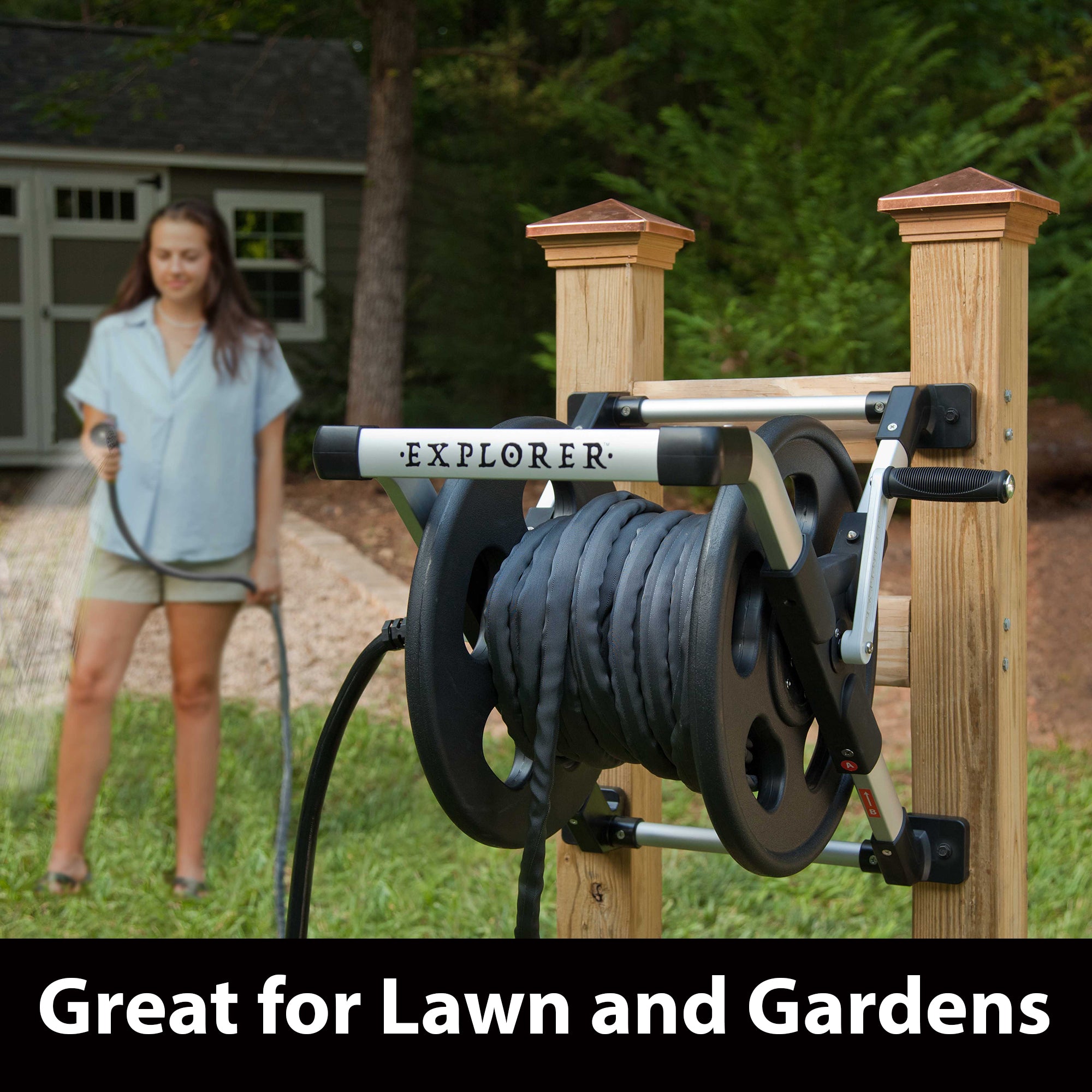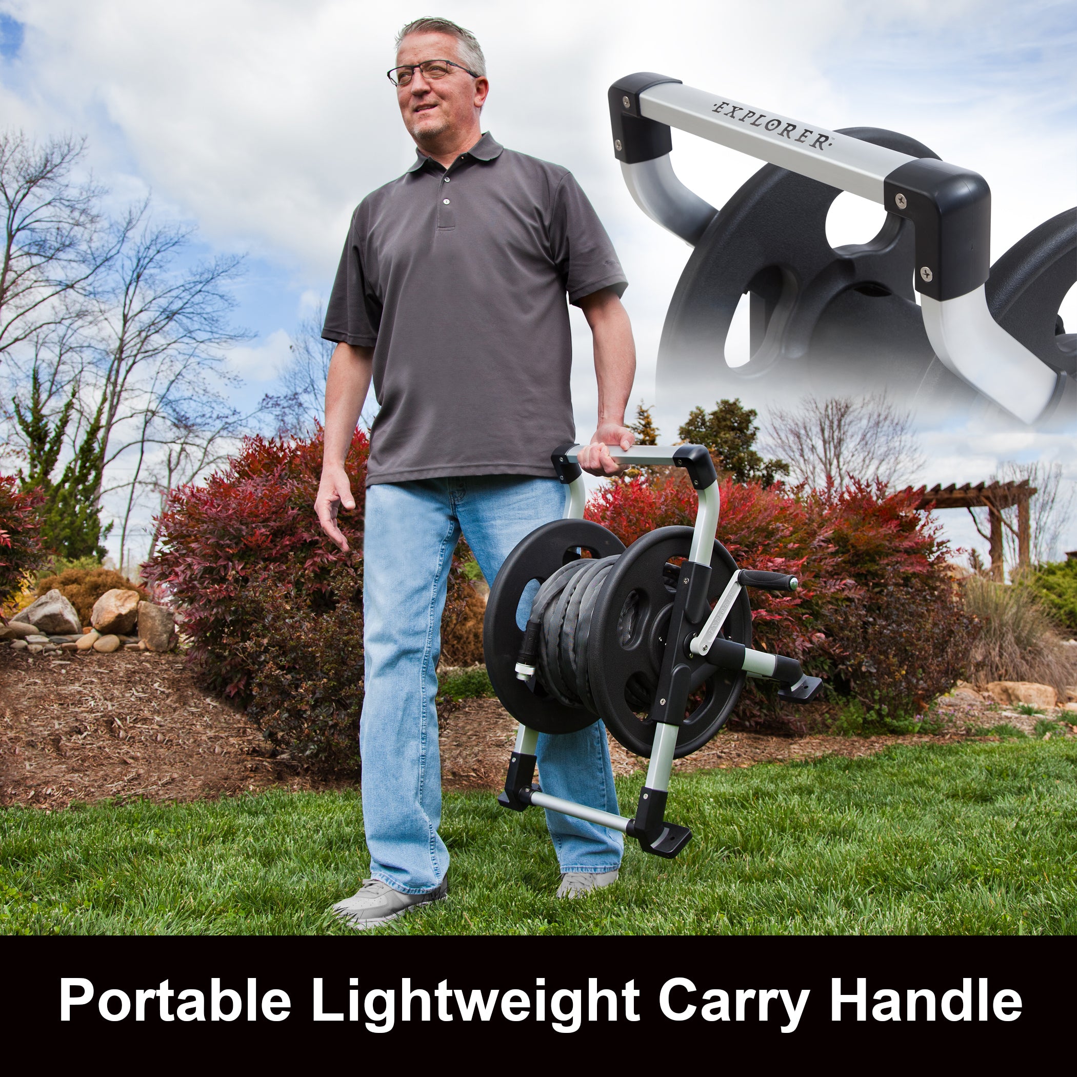 Made to hold up to 150‘ of 5/8" garden hose, up to 100‘ of 3/4" garden hose and 200‘ of expandable hose. The Explorer hose reel is constructed of an aluminum frame, blow molded resin spool, stainless steel fasteners and anodized aluminum hose connections. All high strength materials for a long lasting and tough product.