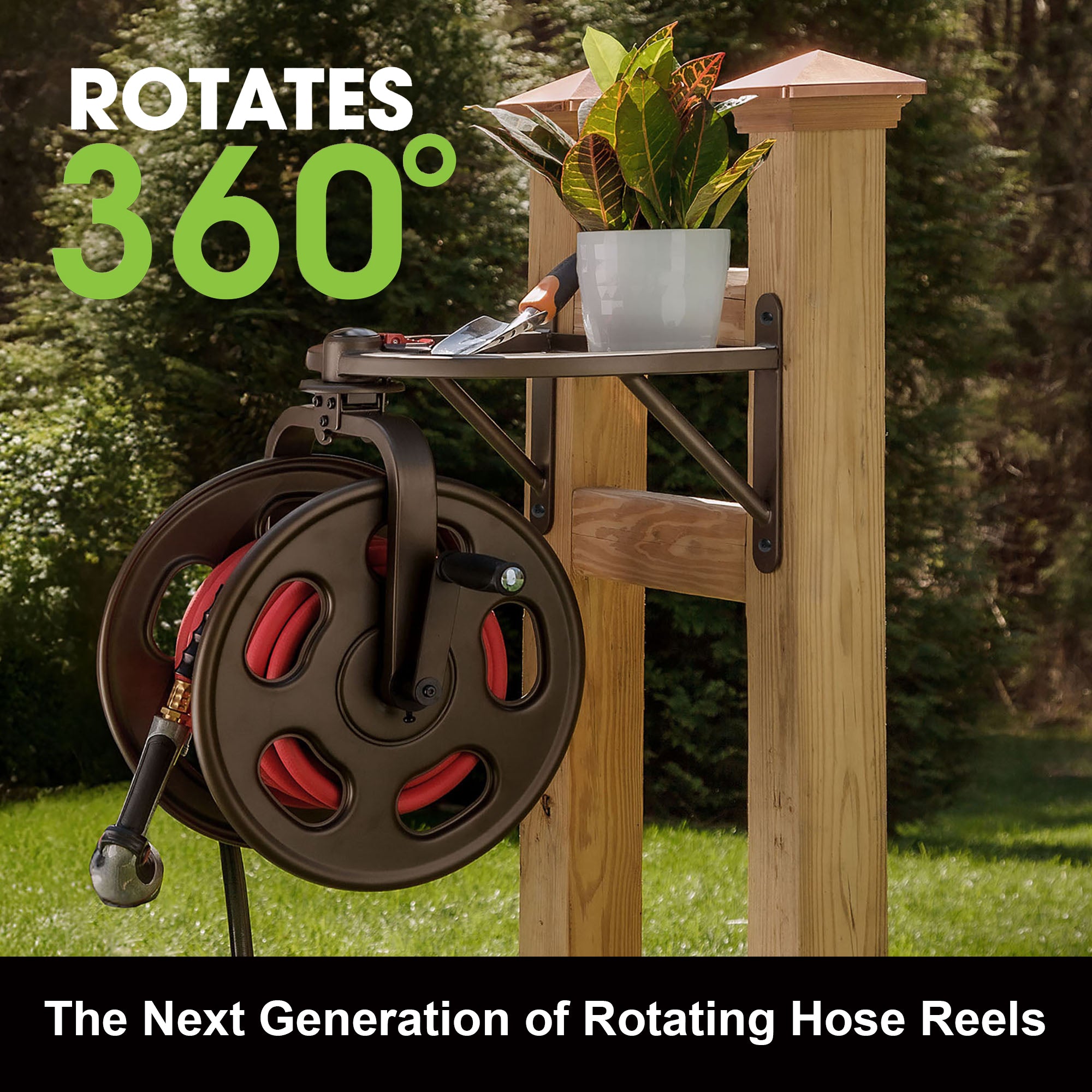 The Navigator Rotating 360° Hose Reel is covered by US patent numbers 9,422,132 and 10,150,645