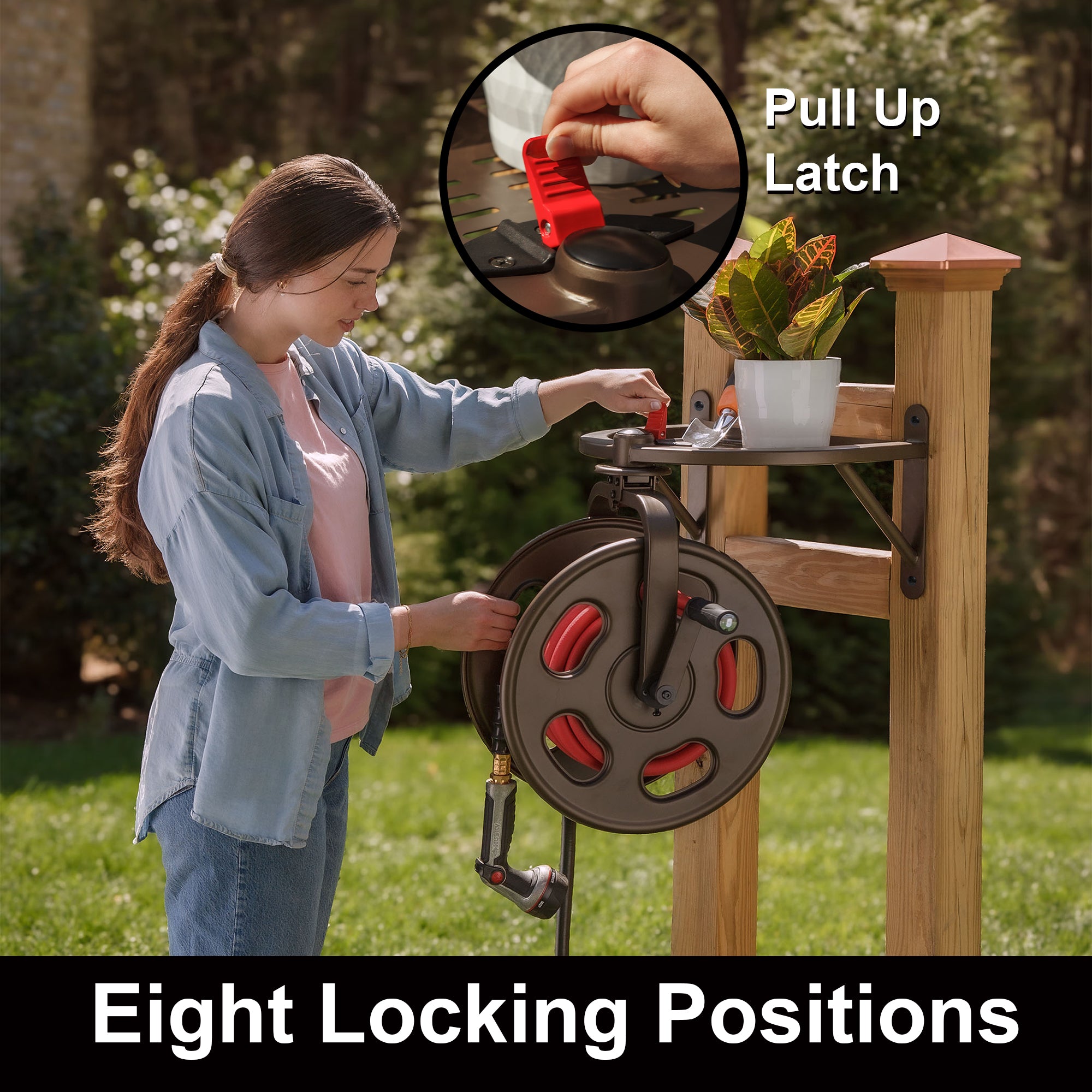 The New 2025 Navigator rotating hose reel is a great addition to our hose reels that rotate 360 degrees. This hose reel now includes a newly designed PULL UP LATCH for easier rotation and movement. The 711 holds up to 125’ of standard 5/8" water hose. New aluminum water connections and a raised connector for larger fittings. Features eight locking positions to help wind and direct hose to the desired location.