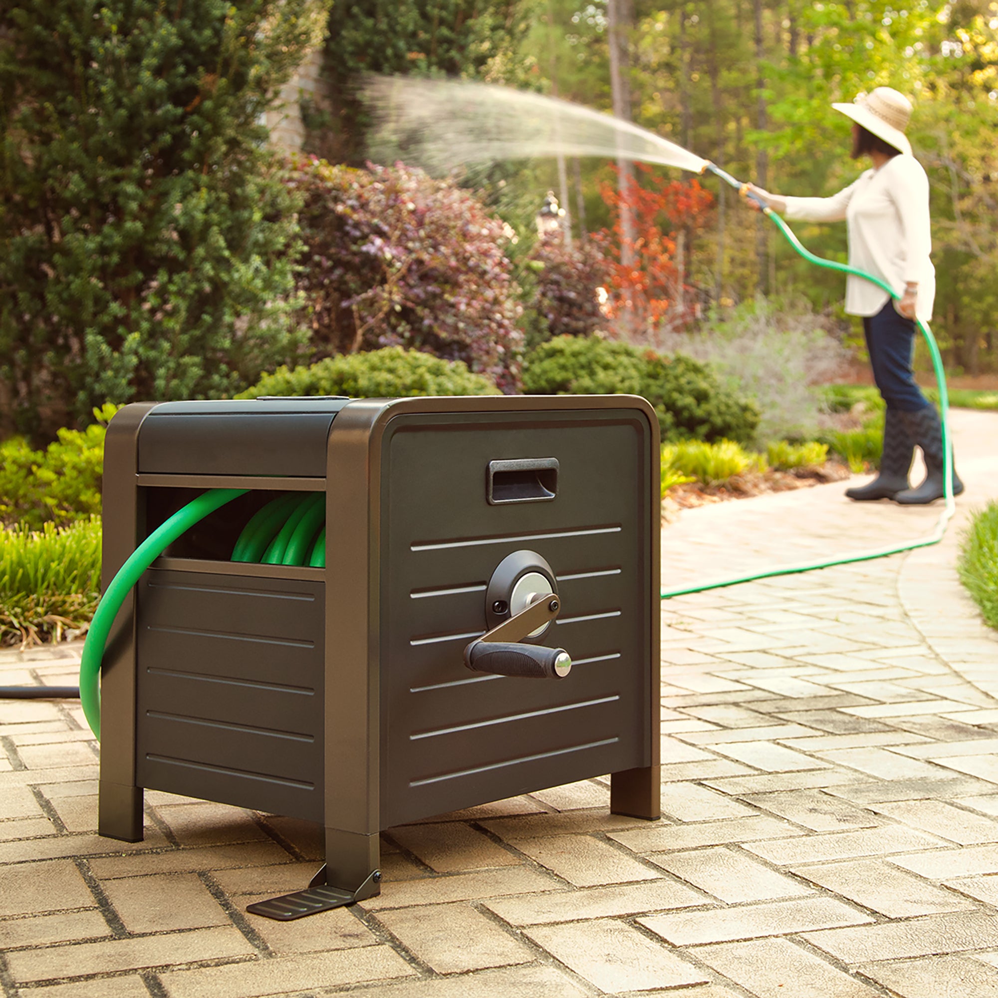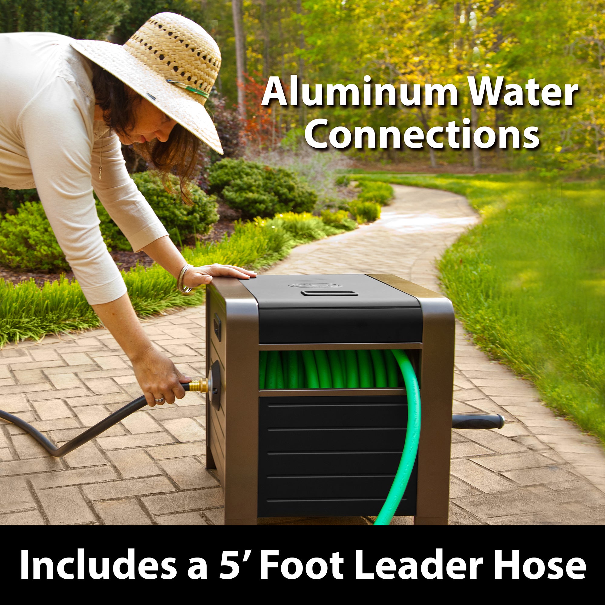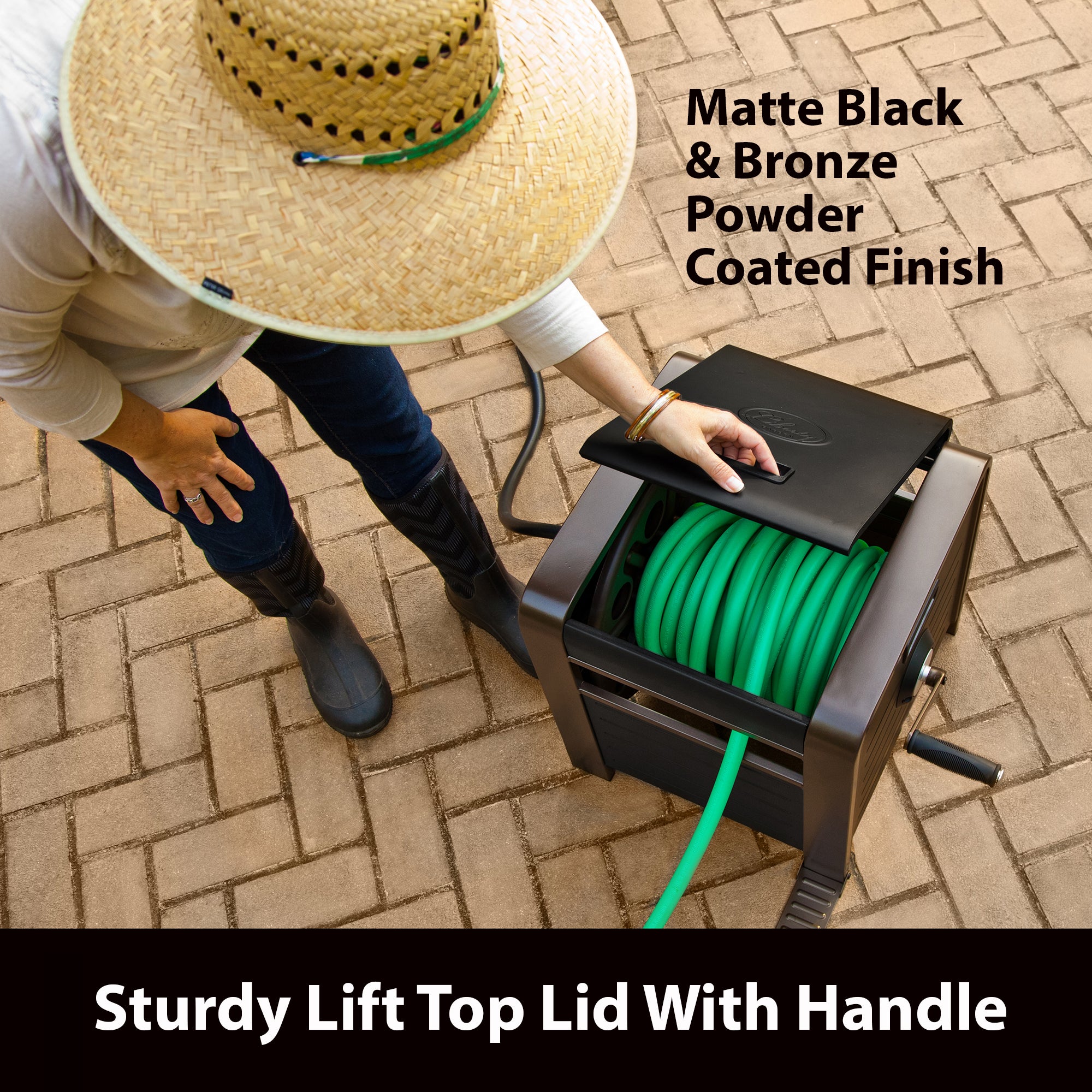 Make garden hose storage simple and easy with our stylish bronze and matte black elite series hose box. This product comes with a 5 ft leader hose, and a high-density rust proof spool which can store up to 200 ft of 5/8in standard garden hose.